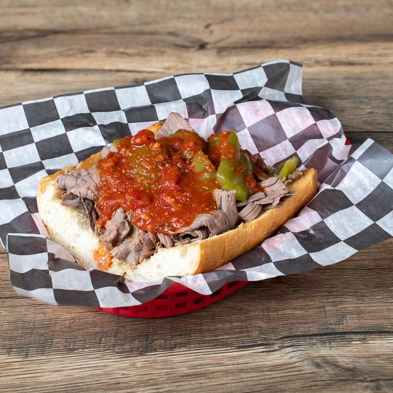 An Italian beef sandwich, originating in Chicago, is composed of thin slices of seasoned roast beef, simmered and served with au jus on a long French roll. The sandwich's history dates back at least to the 1930s. The bread itself is typically dipped (or double-dipped) into the juice the meat is cooked in, and the sandwich is typically topped off with Chicago-style giardiniera or with green Italian sweet peppers. These are deliciously wet sammiches so make sure you have enough napkins!